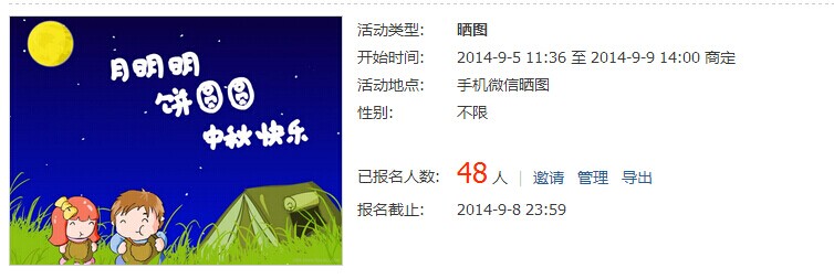活動概述:繼曬美照活動后,微信平臺緊接著推出了曬出全家福活動。訂閱E滁州官方微信號,打開底部菜單的“曬團圓”或者直接回復(fù)“曬團圓”可以獲得參賽鏈接。曬出自己的全家福照片分享到朋友圈拉票,前五名可獲得月餅以及旅游門票。