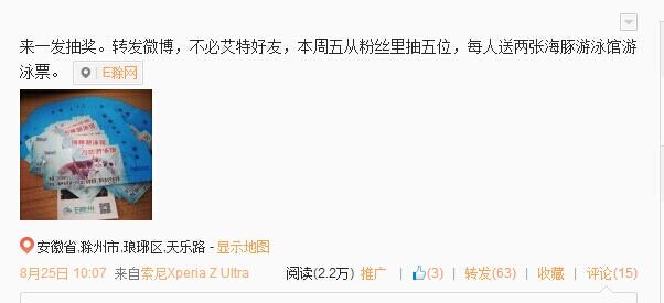 活動主題:來一發抽獎。轉發微博,不必艾特好友,本周五從粉絲里抽五位,每人送兩張海豚游泳館游泳票。
