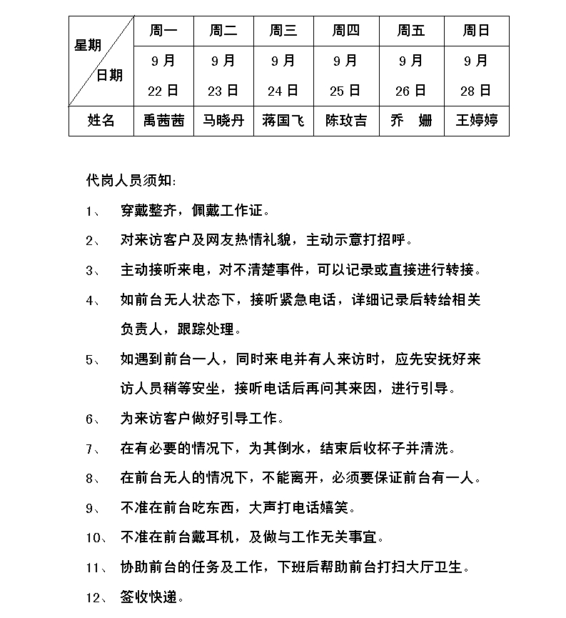 2014年(第39周)9月22日—9月28日前臺代崗人員排班表